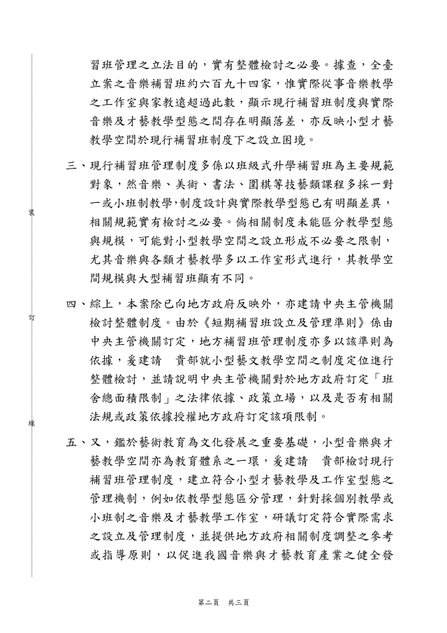 本黨認為,政府應檢討現行補習班管理制度,研議建立「小型才藝教學工作室」的合法制度,針對一對一或小班制教學的實際需求,訂定合理的空間、消防與管理規範,使音樂與才藝教育工作者能在合法與安全的環境下從事教學工作。