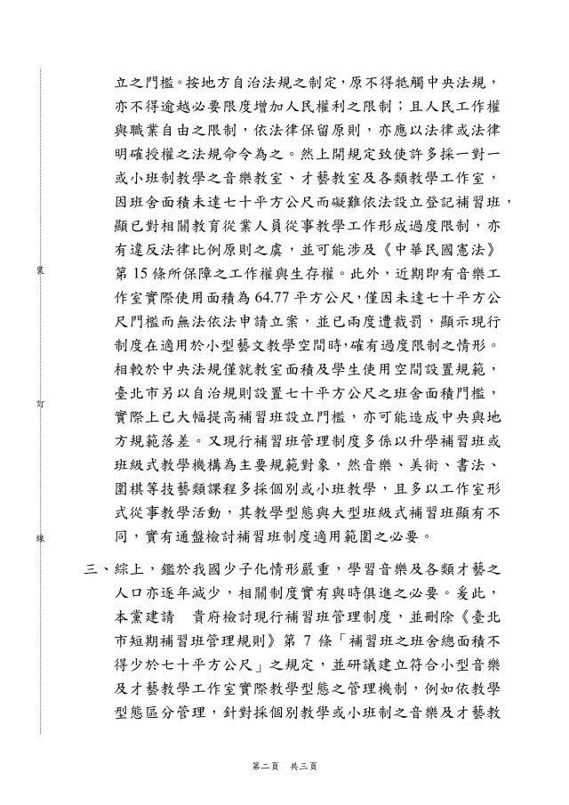 近日,本黨接獲多位音樂教師陳情,因無法符合「班舍總面積 70 平方公尺」之規定,致使小型音樂教室與教學工作室難以符合立案條件,而遭臺北市政府裁罰二十萬元。