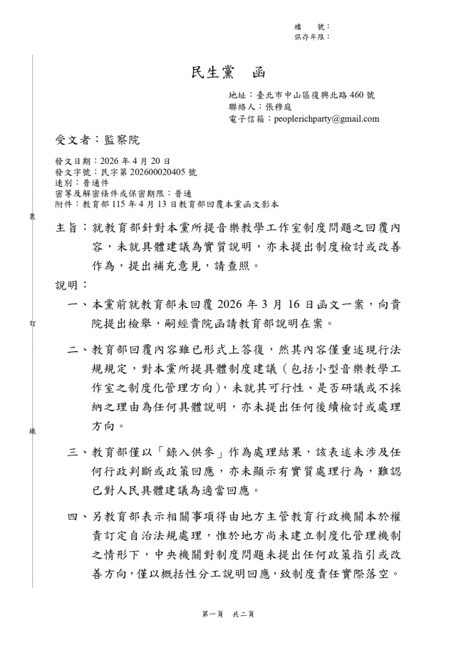 對此,民生黨表示,將另行回函,持續就制度合理性提出檢討,並促請相關機關釐清法源依據及管理原則。